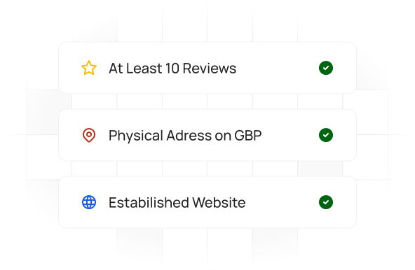 Our services require a well-structured Google Business Profile with a physical and digital address and at least 10 reviews. Without these, optimal results are unlikely. Additionally, keyword success depends on your website's content and GBP optimization. If these aren't properly set up, even our best effort can't guarantee effective rankings.